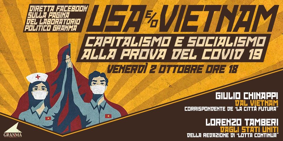 Venerdì 2 ottobre alle ore 18 italiane avrà luogo un dibattito in diretta Facebook sulla pagina del Laboratorio Politico Granma. Verranno affrontate tematiche riguardanti la reazione dei vari Paesi al Covid-19, raffrontando in particolare i casi degli Stati Uniti e del Vietnam. Interverranno Giulio Chinappi dal Vietnam e Lorenzo Tamberi dagli Stati Uniti.