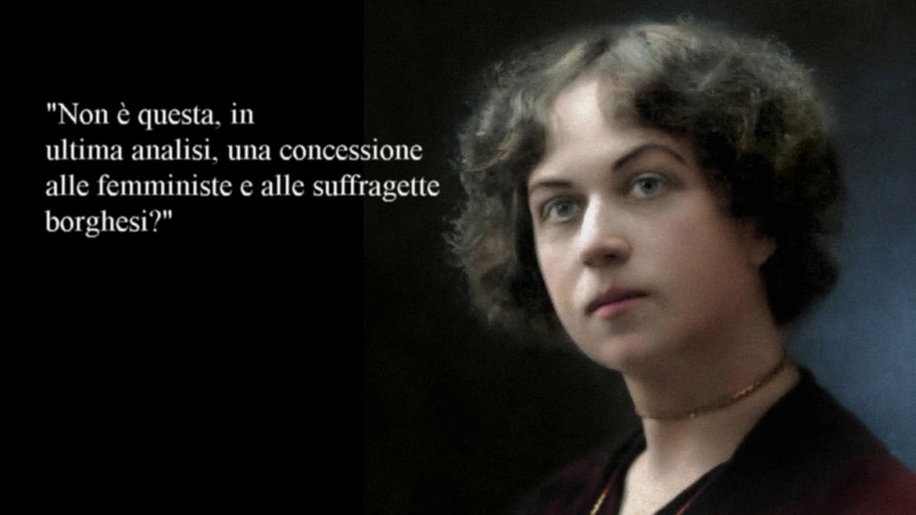 Le strade delle lavoratrici e delle suffragette si sono separate da tempo. C’è una enorme differenza tra i loro obiettivi. C’è anche una enorme contraddizione tra gli interessi della lavoratrice e quelli della signora, della serva e della padrona… Non c’è e non può esserci alcun punto di contatto, convergenza o conciliazione. Perciò i lavoratori non devono temere che ci sia un giorno a parte per la donna, né speciali conferenze per le lavoratrici né una stampa particolare.