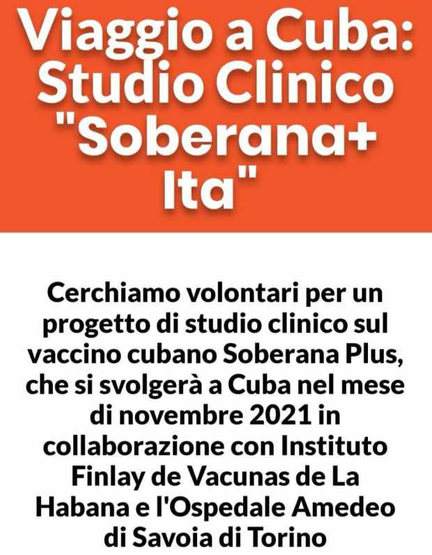 “SOBERANA Plus – ITA” è il nome dello studio clinico osservazionale che sarà condotto a L’Avana (Cuba) e nella città di Torino (Italia), con un gruppo di volontari in buono stato di salute, convalescenti da COVID-19 (guariti da COVID 19 prima del 15/9/21) e vaccinati in Europa (ultima dose prima del 15/8/21), che riceveranno una singola dose di richiamo del vaccino cubano SOBERANA®Plus, che ha avuto ottimi risultati negli studi clinici effettuati e già inoculato a circa tre milioni di cubani.