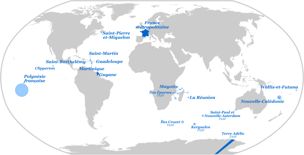 Dall’epoca coloniale, poi, la Francia ha ereditato alcuni territori che, attraverso referendum popolari, hanno preferito restare legati alla madrepatria, principalmente per ragioni economiche. Oggi, la cosiddetta Francia d’oltremare è composta da cinque dipartimenti e regioni d’oltremare (DROM, ovvero Guadalupa, Martinica, Guyana Francese, Réunion, Mayotte) e sei collettività d’oltremare (COM, ovvero Polinesia Francese, Saint-Barthélemy, Saint-Martin, Saint-Pierre-et-Miquelon, Wallis-et-Futuna e Nuova Caledonia, la quale gode di uno statuto speciale).