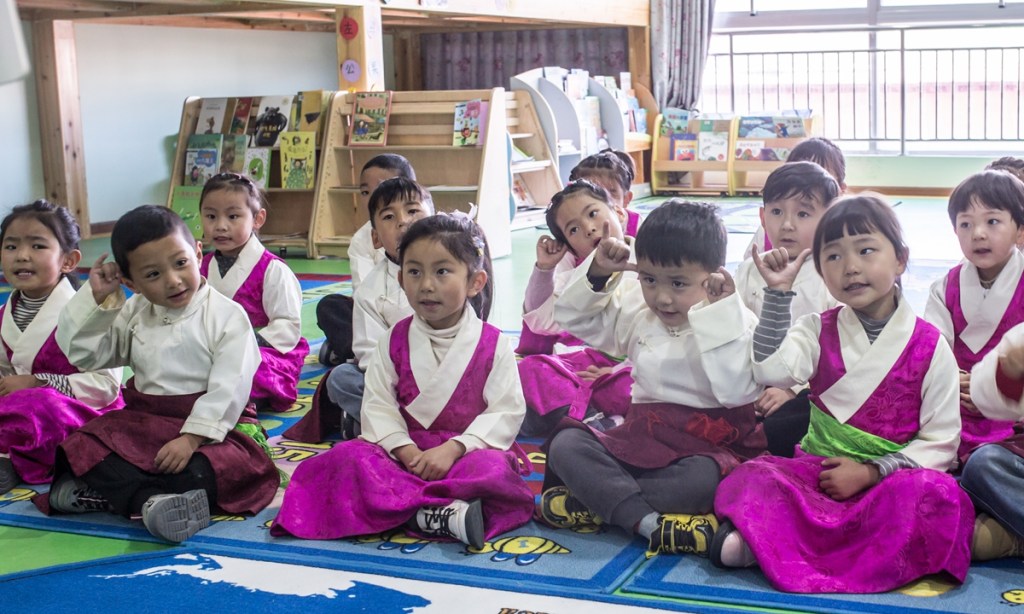 Dopo l’iscrizione agli asili, i bambini dei gruppi etnici tibetani vengono immersi in un ambiente sistematico di acquisizione linguistica a scuola.