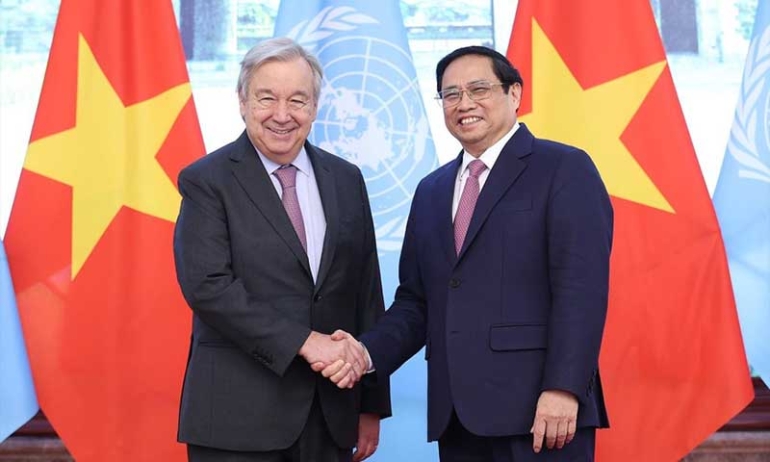 Nel corso della sua permanenza a New York, il primo ministro vietnamita ha incontrato anche il segretario generale delle Nazioni Unite, il portoghese António Guterres. In quest’occasione, Phạm Minh Chính ha elogiato il ruolo e il contributo del segretario generale alla pace, alla stabilità e alla sicurezza internazionale e alla risoluzione delle questioni calde, affermando al contempo che il Vietnam sostiene sempre ed è pronto a contribuire a tali sforzi. Il primo ministro ha affermato che il Vietnam sta collaborando attivamente con le organizzazioni delle Nazioni Unite, in particolare nel garantire la sicurezza internazionale, partecipando alle missioni di mantenimento della pace delle Nazioni Unite nelle aree calde, trasformandosi per realizzare gli obiettivi di sviluppo sostenibile, una giusta transizione energetica e l’equità sociale.