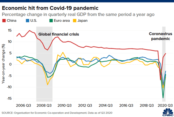 Grafico 1: variazione percentuale del Pil in Cina, Usa, Eurozona e Giappone fra 2006 e 2020.
