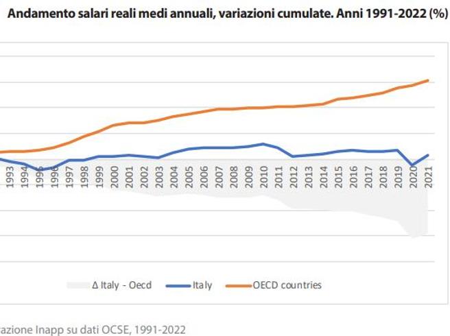 Nel 2022, i lavoratori dipendenti del settore privato italiano, esclusi settore agricolo e domestico, sono stati 16.978.425 e il salario medio si e attestato a 22.839 euro lordi annui. Si e trattato di un aumento salariale nominale medio del +4,2% rispetto al 2021 (+911 euro lordi annui), nettamente inferiore all’inflazione del 2022. Quindi, per poter compensare pienamente l’aumento dei prezzi al consumo registrato nel solo 2022, il salario medio si sarebbe dovuto attestare a 23,8 mila euro lordi annui, cioè circa mille euro in piu rispetto a quanto percepito mediamente proprio dagli ultimi 40 anni di politiche del lavoro.