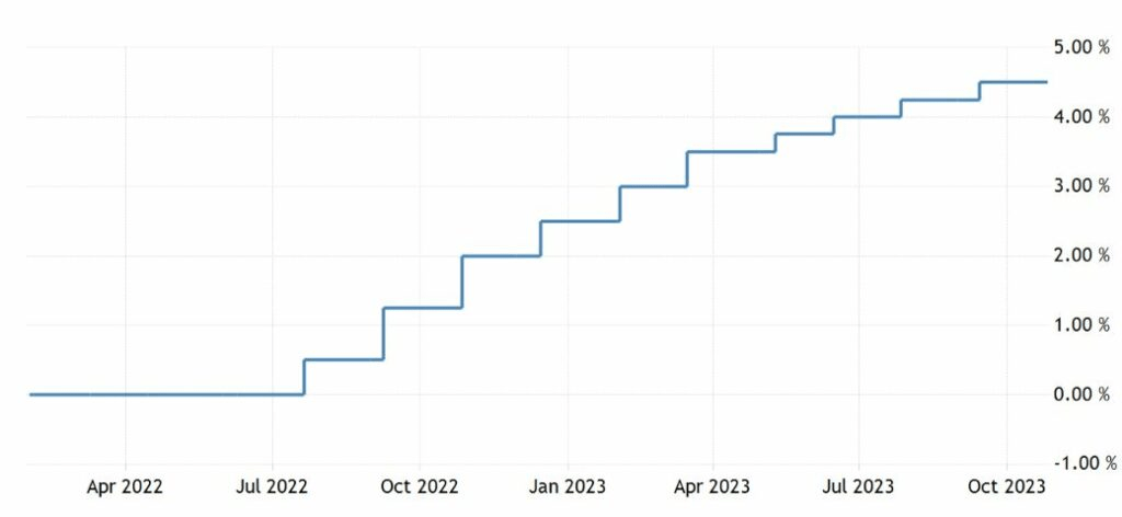 A seguito della fiammata inflazionistica dell’aprile 2022 (+3,45% su base congiunturale), che porta il tasso tendenziale annuo al 11,9% e al suo persistere sui tali livelli per tutto il secondo trimestre (grafico 2), la Bce il 21 luglio vara dopo un decennio il primo aumento del tasso di riferimento dell’Eurozona, innalzandolo da 0 a 0,50% (grafico 3). L’immediata inversione della curva dell’inflazione tendenziale registrata a partire dal mese seguente spinge la presidente Christine Lagarde ad ulteriori tre revisioni al rialzo del tasso di riferimento entro la fine dell’anno: l’8 settembre e il 27 ottobre aumenti dello 0,75%, mentre il 15 dicembre dello 0,50% facendo attestare il valore dell’indice in questione al 3%. L’intervento del board della Bce riesce, quindi, a far ripiegare il tasso di inflazione tendenziale a dicembre 2022 al 6%, dimezzandolo nell’arco di 6 mesi. Primi interventi, ai quali faranno seguito altri 6 aumenti successivi, fino all’ultimo dell’ottobre 2023 che condurrà il tasso di riferimento al 4,5 (grafico 3); politiche monetarie restrittive, adottate sulla scia della Federal Reserve, finalizzate a far rientrare l’inflazione tendenziale sotto la soglia del 2%, obiettivo strategico della mission della Bce.