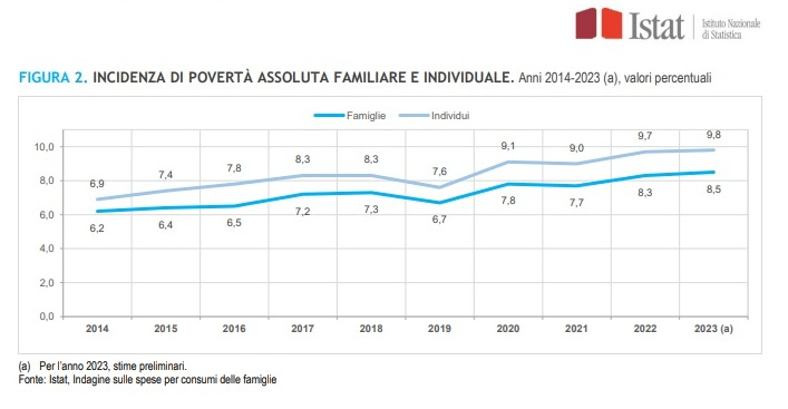 Grafico 4: tasso di povertà assoluta individuale e familiare il Italia, periodo 2014-2023. Fonte: Istat