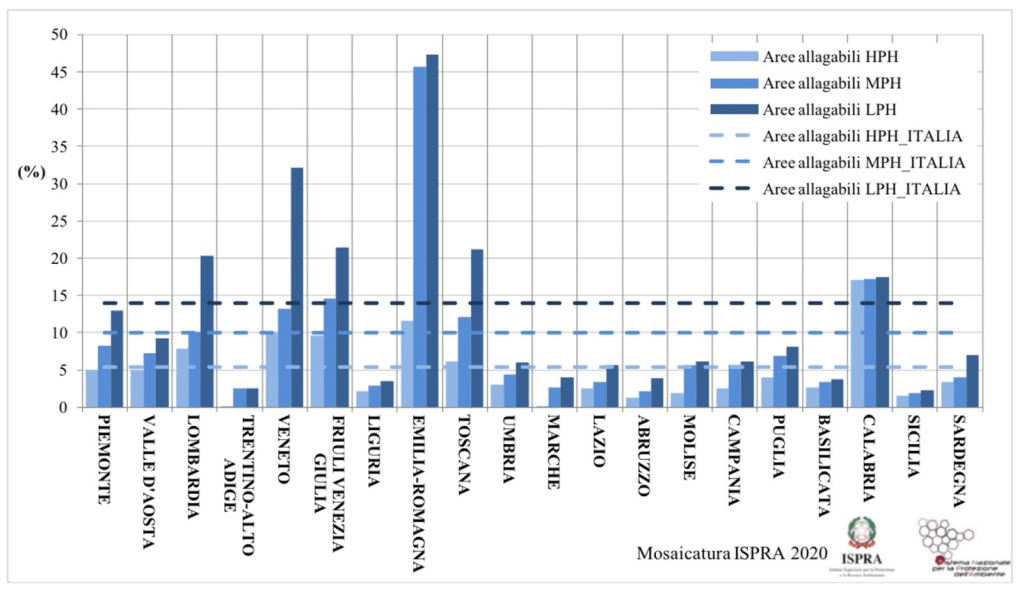 Grafico 1: percentuale di territorio delle regioni italiane (istogramma) e relative medie nazionali (diagramma lineare tratteggiato) interessato dai 3 livelli di probabilità di alluvione: alta (P1 – HPH), media (P2 – MPH) e bassa (P3 – LPH). Fonte: mosaicatura Ispra 2020