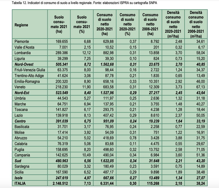 Tabella 1: consumo di suolo in Italia e nelle regioni nel 2021. Fonte: Ispra