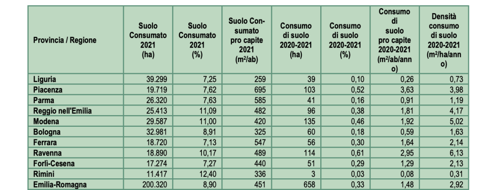 Tabella 2: consumo di suolo in Emilia Romagna e nelle sue province nel 2021. Fonte: Ispra