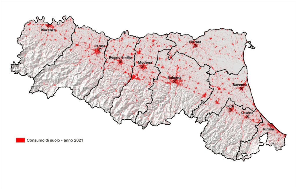 Una tendenza in atto da decenni che veniva confermata anche nel 2021, quando con un consumo di suolo annuo di 658 ha, pari al 10,5% dell’incremento nazionale (6.331 ha), l’Emilia Romagna è risultata la terza regione per nuove aree cementificate dopo Lombardia (883 ha) e Veneto (684 ha).