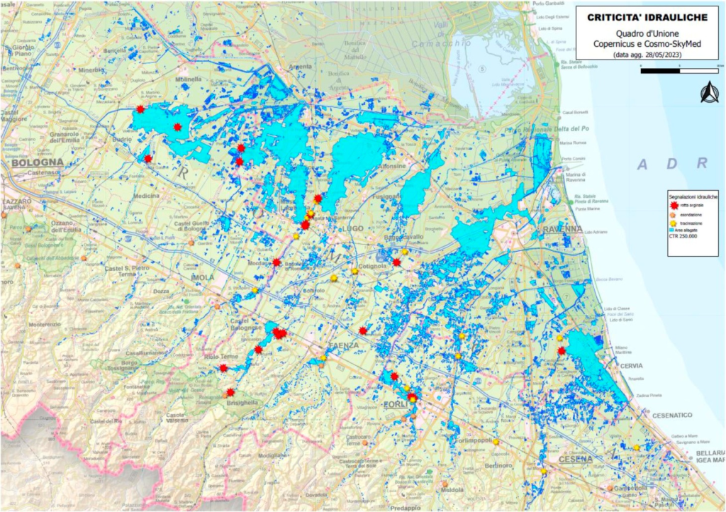 Nelle prime settimane del mese di maggio del 2023 la Romagna e la provincia di Bologna, a seguito della prolungata permanenza di una vasta zona di bassa pressione definita in gergo meteorologico “palude barica”, sono state interessate da precipitazioni eccezionalmente copiose, rivelatesi, insieme a fattori di altra natura, fondamentali concause della rottura degli argini di numerosi fiumi che, nell’arco di quindici giorni, hanno allagato per ben due volte ampie porzioni della parte sud orientale della superficie regionale. Se ad inizio mese erano esondati tre fiumi, Lamone, Senio e Sillaro, riversando 120 milioni di m3 di acqua nella pianura circostante, il 16 maggio la Protezione Civile emiliana1 rendeva noto che altri 18 corsi d’acqua2 avevano rotto gli argini provocando il deflusso di una quantità tale di acqua da provocare allagamenti in ben 37 comuni3 (carta 1).