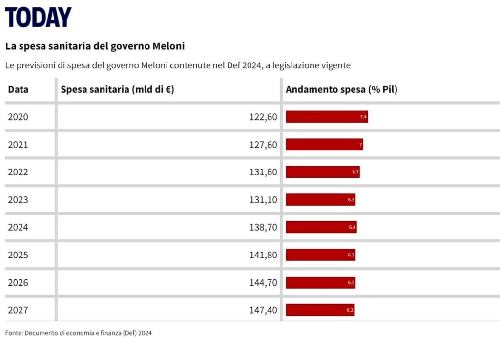 Detto in estrema sintesi se rapportassimo la spesa sanitaria in rapporto al PIL, solo per tornare ai livelli del 2019 (6,4%), l’aumento della spesa dovrebbe essere di ben 2,8 miliardi nel 2025, di 4,3 nel 2026 e 5,6 nel 2027.