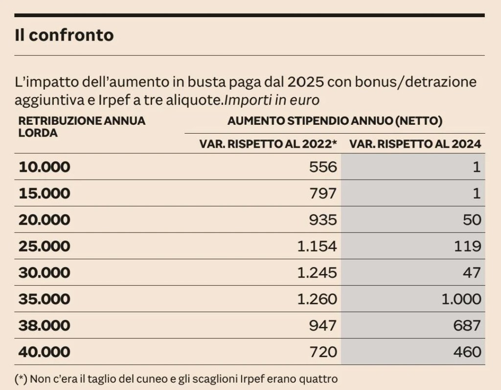 I redditi tra i 35 e i 40mila euro annui fino a questo anno esclusi dai tagli al cuneo fiscale ma dal prossimo anno trarranno indubbi vantaggi. I beneficiari dei tagli al cuneo fiscale nel 2025 passeranno dai 13 milioni attuali a oltre 14 milioni.