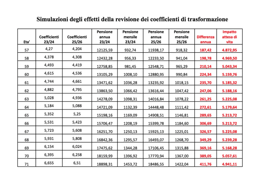 Ai fini dell’assegno pensionistico, visto che i contributi versati non torneranno di sicuro nelle tasche del lavoratore o della lavoratrice, vale il coefficiente di rivalutazione. Ebbene, la manovra di bilancio abbassa il coefficiente e, se prima, a parità di anni versati, avrebbe preso 1.250 euro al mese, con il nuovo coefficiente invece, nel 2025-2026, percepirà un assegno da 1.225 euro, con una perdita di 25 euro al mese per tredici mensilità annue.