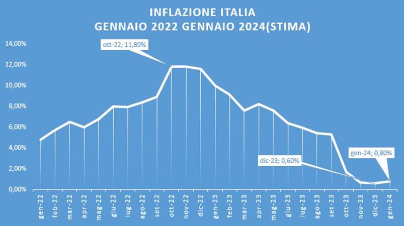 Grafico 4: tasso di inflazione mensile in Italia fra gennaio 2022 e gennaio 2024 (stima). Fonte Istat