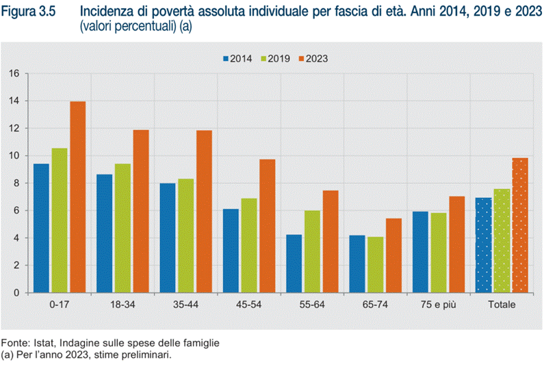 Grafico 3: percentuale di popolazione in condizioni di povertà assoluta per fasce d’età, confronto 2014, 2019 e 2023. Fonte Istat
