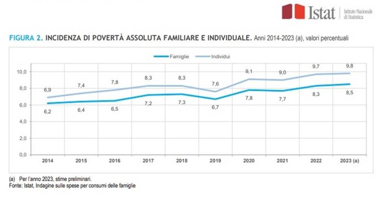 Nonostante il numero degli occupati risulti dunque in consolidato trend crescente, l’Istat nel suo “Rapporto annuale 2024” pubblicato nel maggio scorso, conferma l’inesorabile crescita delle sofferenze sociali: “Nel 2023 l’incidenza della povertà assoluta in Italia è pari all’8,5% tra le famiglie e al 9,8% tra gli individui” (grafico 2).
