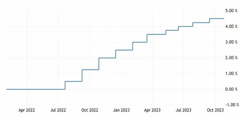 Grafico 4: tasso di riferimento della Banca Centrale Europea. Periodo: aprile 2022- ottobre 2023