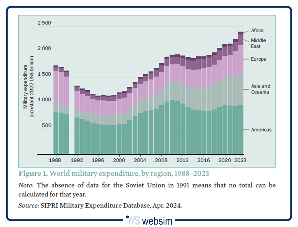 Grafico 1: spese militari mondiali e per macroregioni geografiche 1988-2023. Fonte Sipri aprile ’24