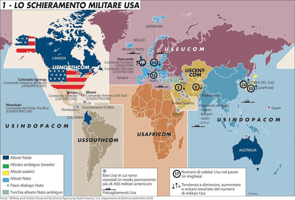 Carta 1: lo schieramento militare Usa nel 2019 e le 6 aree con rispettivi comandi centrali. Limes