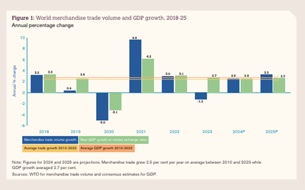 Tasso di variazione annua dell’economia mondiale (istogramma verde) fra 2018-2023 con previsioni 2024. Le previsioni per il 2025 saranno sicuramente riviste al ribasso. Fonte: Wto