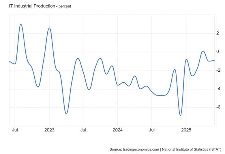 Grafico 1: variazione della produzione industriale mensile su base tendenziale dell’Italia negli ultimi 3 anni, giugno 2022 – giugno 2025. Fonte Istat.