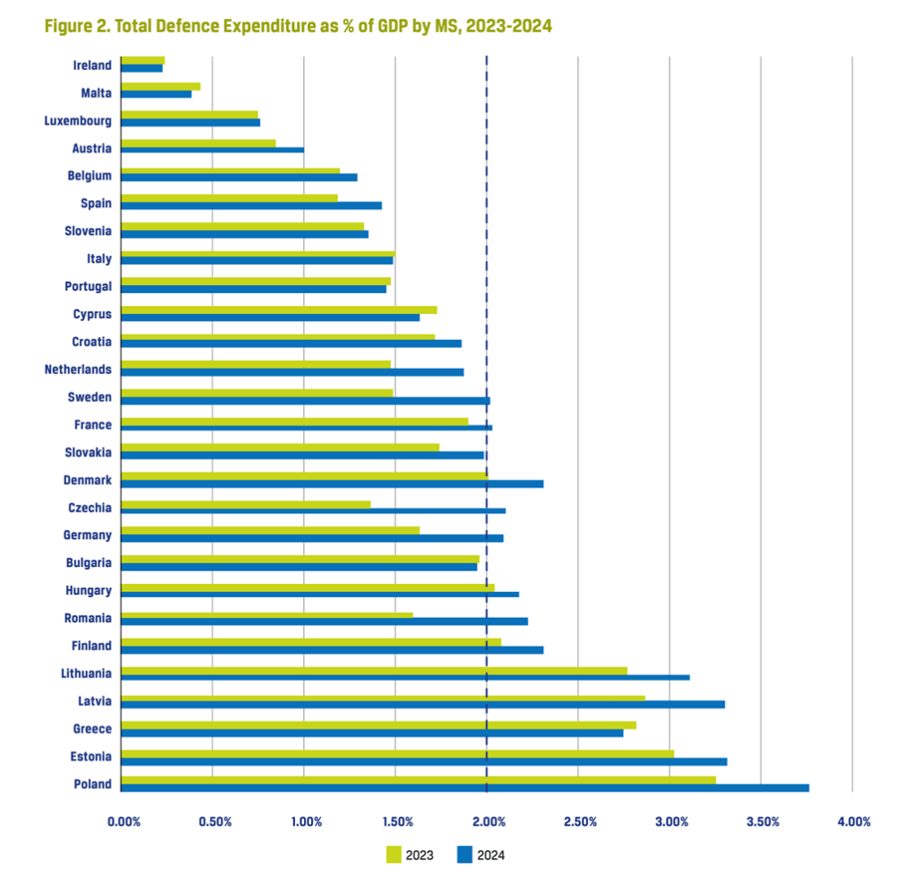 - Nel 2024, 24 Stati membri hanno raggiunto il parametro di riferimento del 20% per gli investimenti nella difesa, rispetto ai 20 del 2023, una tendenza in accelerazione poiché i paesi destinano una quota sempre maggiore della loro spesa agli investimenti.