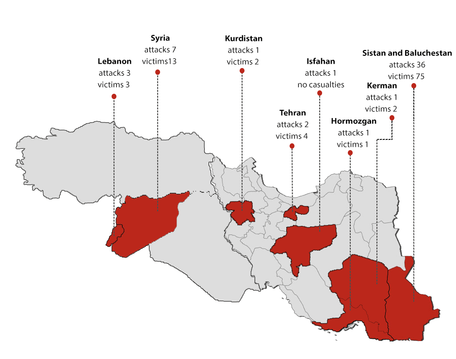 Ancora una volta, la provincia del Sistan e Belucistan ha registrato il maggior numero di attacchi terroristici rispetto alle altre regioni del Paese. Delle 52 operazioni terroristiche a livello nazionale, 42 si sono verificate all’interno dell’Iran, 36 delle quali in Sistan e Belucistan, segnando un aumento dell’80% in questa provincia rispetto all’anno precedente.