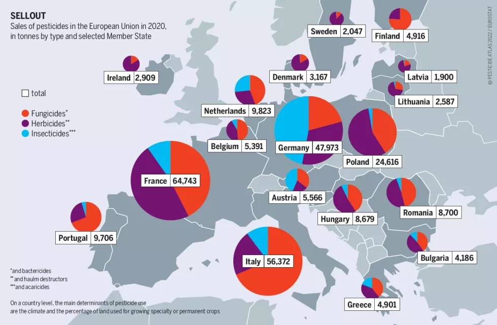 L’azienda leader nelle vendite è la tedesca BASF, principale gruppo chimico a livello mondiale, con 33 mila tonnellate di questo tipo di prodotti tossici. Tra le 5 e le 12 mila tonnellate si collocano le multinazionali Teleos Ag Solutions, Agria, Corteva, Bayer, Alzchem e Syngenta. Quest’ultima, il gigante chimico della Svizzera – paese che non fa parte dell’Unione Europea – ha venduto circa 9 mila tonnellate, per lo più attraverso filiali tedesche.