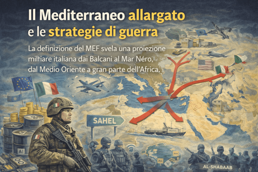 La definizione di “Mediterraneo allargato” adottata dal MEF per la Difesa svela una proiezione strategico-militare italiana che abbraccia Balcani e Mar Nero, Medio Oriente e gran parte dell’Africa. Dietro sicurezza e “terrorismo” riemergono energia, materie prime e nuove logiche di guerra.