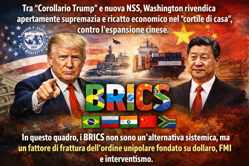 Tra “Corollario Trump” e nuova NSS, Washington rivendica apertamente supremazia e ricatto economico nel “cortile di casa”, contro l’espansione cinese. In questo quadro, i BRICS non sono un’alternativa sistemica, ma un fattore di frattura dell’ordine unipolare fondato su dollaro, FMI e interventismo.