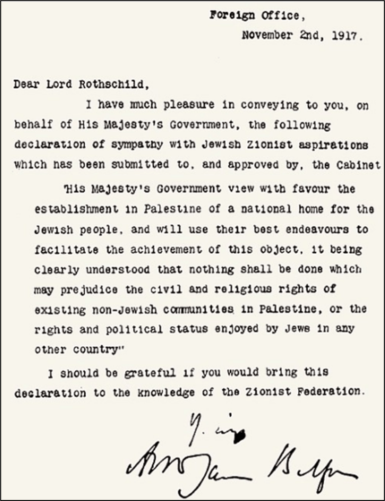 Per tali motivazioni il Segretario per gli Affari Esteri britannico del tempo, Arthur Balfour, indirizzò una lettera a Lord Rothschild, membro di una importante famiglia di banchieri ebrei britannici, considerato il principale rappresentante della comunità ebraica in Inghilterra, nella quale si esprimeva favorevole alla creazione di un «focolare nazionale ebraico» in Palestina (immagine 1).