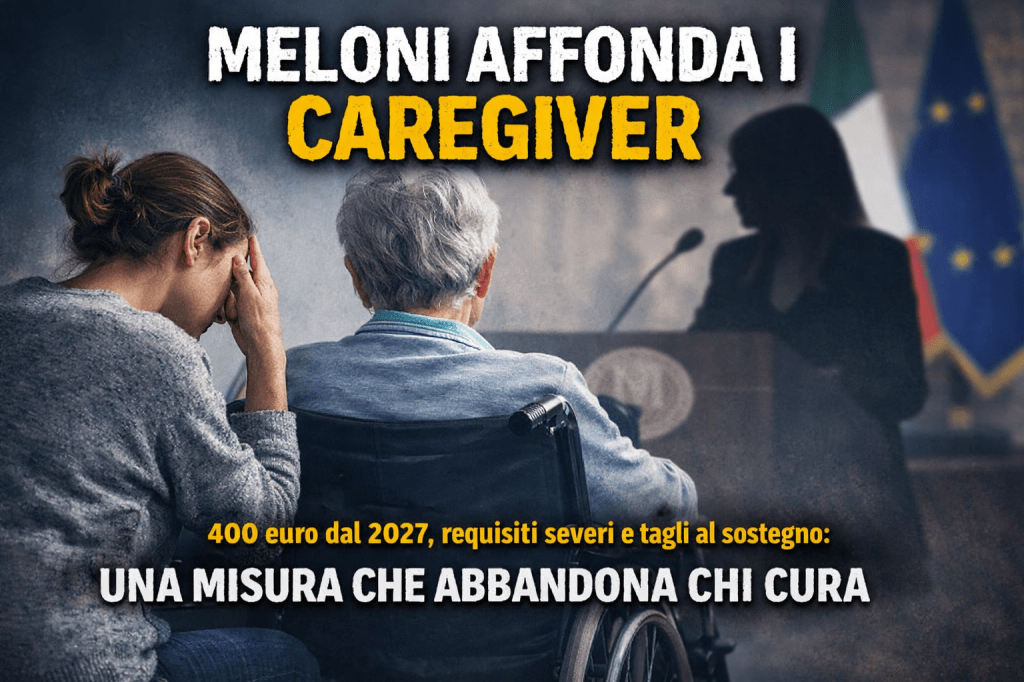 Il Governo Meloni promette tutele ai caregiver familiari, ma il nuovo disegno di legge si traduce in un sostegno tardivo e irraggiungibile: fino a 400 euro dal 2027, requisiti severissimi e tagli nel 2026. Una misura che abbandona chi cura.