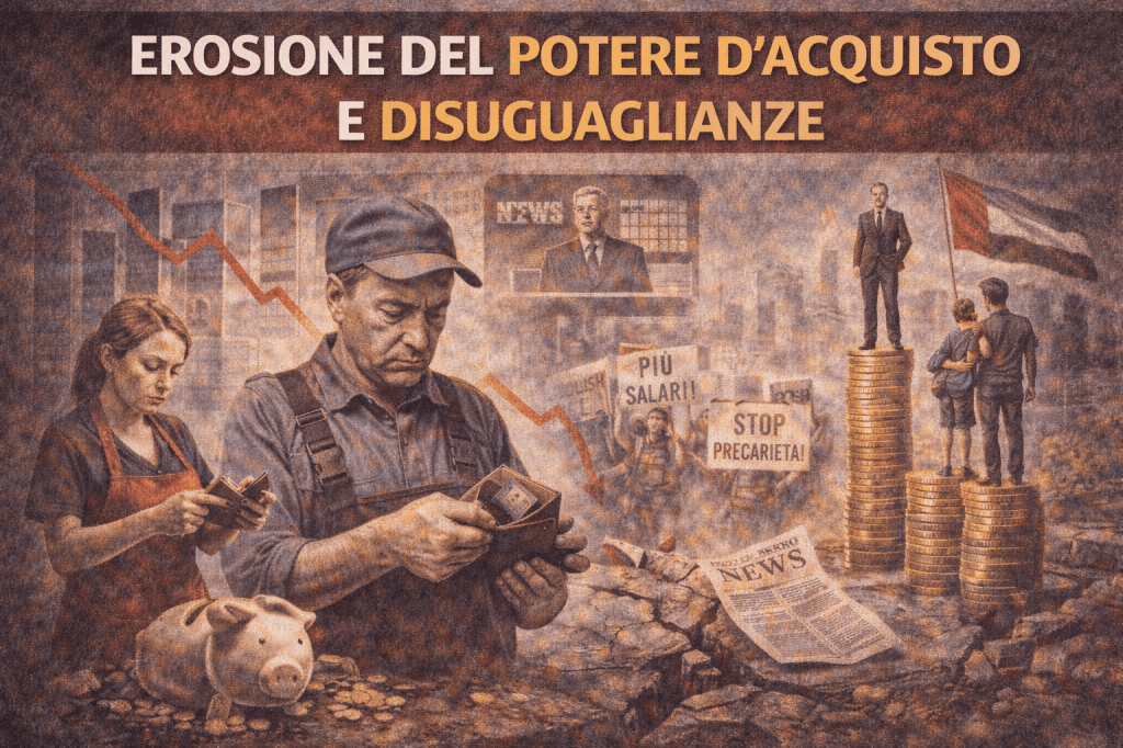 L’erosione del potere d’acquisto viene ormai trattata come un destino inevitabile, spingendo lavoratori e sindacati verso compromessi al ribasso e distogliendo l’attenzione dai salari reali. Intanto crescono precarietà e disuguaglianze territoriali e di genere, mentre la comunicazione dominante normalizza l’impoverimento.