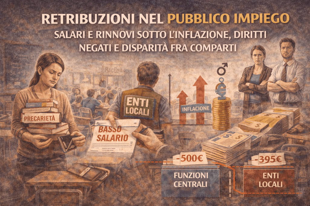 Nel pubblico impiego salari e rinnovi restano inferiori all’inflazione, con forti disparità tra comparti: la Scuola è la più penalizzata e negli Enti Locali il divario retributivo rispetto alle Funzioni centrali è strutturale. Persistono inoltre precarietà e differenze salariali di genere.