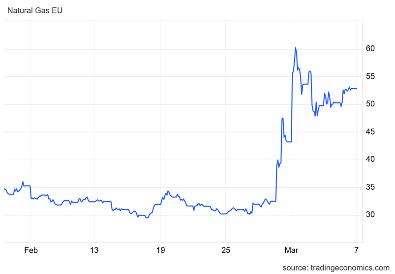 L’attacco di sabato 28 è avvenuto a borse a chiuse con il Brent fissato il giorno precedente a 73 dollari/barile e il gas a 32 euro a megawatt/ora sul mercato TTF di Amsterdam. Dopo una settimana, alla chiusura di venerdì 6 marzo il Brent si era impennato a quasi 93 dollari (grafico 1) e il gas sopra ai 53 euro/MWh (grafico 2), con un aumento settimanale rispettivamente del 27,77% e del 65,62%. Lunedì 9 il trend rialzista non mostra soluzione di continuità col Brent chiude a 99 dollari al barile (+6,8% giornaliero) e il gas sul T6TF a 56,45 €/MWh (+5,75% giornaliero).