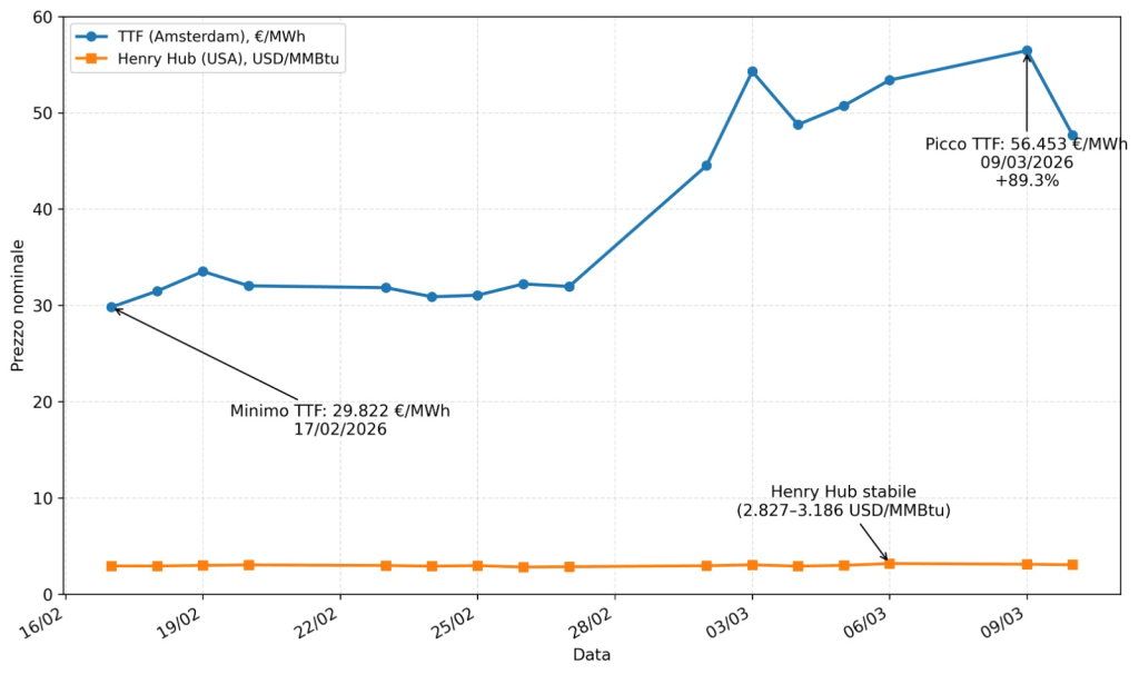 Grafico 4: quotazione del gas sul mercato TTF e su quello Henry Hub a febbraio-marzo 2026 (elaborazione di Giulio Chinappi)