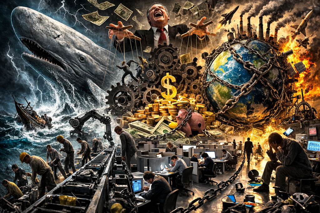 Il video comincia con una citazione letteraria tratta dal famoso romanzo di Herman Melville Moby Dick, il cui protagonista è il capitano Achab, il quale pensando al suo desiderio ossessivo di catturare ed uccidere la temibile balena bianca osserva: “Il mio scopo è folle, ma i mezzi da me impiegati sono razionali”. Secondo il Marx del video questa frase coglie perfettamente la natura profonda del sistema capitalistico, che oggi vediamo nella sua forma più spietata e crudele. E, in effetti, se tentiamo di disvelare la finalità primaria di questo sistema, comprenderemo che esso mira all’accumulazione infinita di ricchezza nelle mani di pochi, in un contesto (la terra), le cui risorse sono limitate, utilizzando mezzi sempre più raffinati, basati sul calcolo razionale, la ricerca scientifica e l’innovazione tecnologica, non preoccupandosi minimamente dei bisogni dell’umanità. Anzi producendo spesso con il suo sistema economico-sociale oggetti dannosi o inutili alla soddisfazione di questi bisogni anche elementari (basti pensare alle armi ormai sempre più terribili per le loro capacità distruttive).