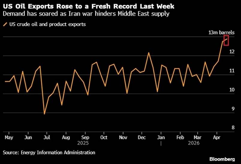 Secondo Bloomberg, nella seconda settimana di aprile le esportazioni di petrolio greggio e prodotti raffinati statunitensi hanno raggiunto il record di 12,9 milioni di barili al giorno, raddoppiando da gennaio 2022 (grafico 1), vale a dire da prima delle sanzioni occidentali alla Russia e del Piano REPowerEu che hanno reindirizzato l’approvvigionamento europeo anche oltre Atlantico. E con una impennata di circa 2,5 milioni di barili al giorno fra greggio e raffinati dall’inizio della guerra all’Iran. L’aumento dell’export petrolifero complessivo risulta, nello specifico, trainato dai ben più redditizi prodotti di raffinazione che hanno raggiunto il record di 8,1 milioni di barili al giorno.